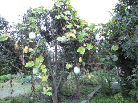 自生した冬瓜(棚にされちゃったのは椿じゃないかな?隣にあるミカンの木まで伸びてます)。